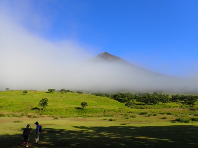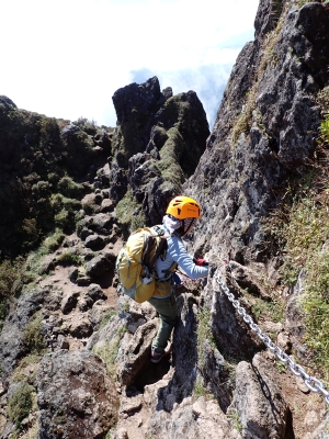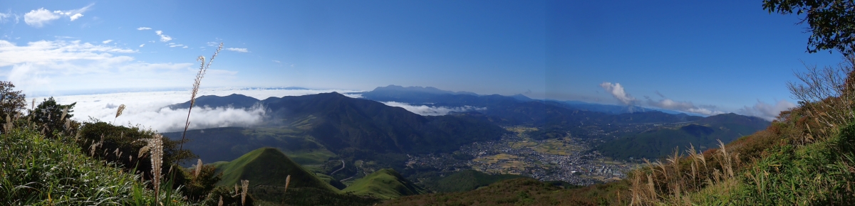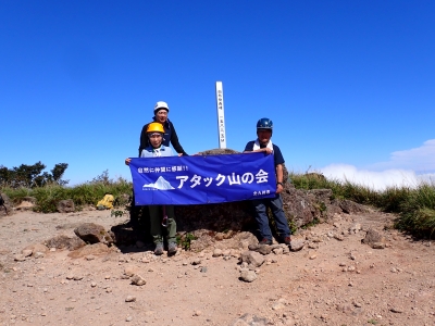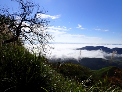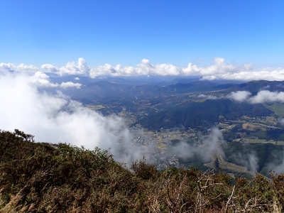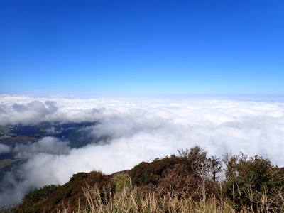 アタック山の会9月の例会山行が、天候の影響で延期になり本日となったが、三連休と運動会シーズンともあって参加者がなんと3名と今まで最小の参加人数となった。CLはM氏、とても残念だけどこういう時もあると互いに励ます。それにしても今年の夏は長い。10月中旬だと言うの日中の気温は30度越である。由布岳の駐車場に着くともちろん快適な気温だが、歩き出すと陽射しを背に受けて暑さを感じ出す。森に入るとしばらくは涼しさを感じる。合野越で一休みして樹林帯を高度を上げながら歩く。ジグザグな道が続き、森を抜けると陽射しが熱い。展望が開けると何と雲海が広がっている。雲の上を歩けるような錯覚を起こす。徐々に足下の石が大きくなってゆき、鞍部の手前ではガレ場となる。その頃には後部から多くの登山者から煽られるようにマタエに着く。さすがにここは標高も高く、風もあって涼しい。日影で少々長い休憩をしていよいよ西峰への岩場へ取付く。ヘルメット、スワミベルト、シュリンゲと少々大げさかも知れないが、安全確保は会の決まりである。特に高齢になると腕力も衰えて自力でのリカバリーは困難である。鎖場を慎重にクリアしてゆく。特に障子戸と言われる岩壁は危険だ。ここでは過去滑落事故で亡くなった方もいる。無事、西峰に着くと展望が迎えてくれた雲海も素晴らしい。ここでランチタイムを過ごしていると登山者が次から次へとやってくる。下山は往路を戻るが、登りで慣れたせいか、スムーズに鎖場をクリアしていった。マタエからの下山は、登ってくる人とのすれ違いでこの山の人気がとてもあることを改めて知る。駐車場が見えてくると暑さが厳しく汗だらけで登山終了。今日も山に自然に仲間に感謝!