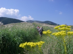 ●山行日:2009年9月6日(日) 晴 ●コース: 俵山峠→俵山→護王峠→堀渡登山口 ●参加人数:37名 ●集合場所:JR小倉駅北口、苅田町役場前、下曽根駅前 ●バス:中型バス(西鉄バス筑豊) ●スタッフ: CL平川善博(Aグループ) SL 屋部博嗣(Bグループ) 班長4名フリー6名(敬称略) ●行程: 苅田役場前(6:00)~下曽根駅(6:20)~JR小倉駅北口(6:40)~鞍手PA(2名乗車)~熊本空港・益城IC~(9:20)俵山峠(9:40)→(11:25)俵山(12:10)~護王峠 (12:40)~堀渡登山口(14:00)~久木野温泉[木の香湯](16:00)~熊本空港・益城 IC~直方PA(2名下車)~小倉駅北口(19:20)~下曽根駅~苅田役場前 ●今回はゆったり登山の企画である。1コースのみ37名と多数のためAグループ17名が 先発し5分後にBグループ20名が出発することにした。例会登山では久し振りに天候 に恵まれたのはよいが山頂気温が31℃、遮るものなし、風なしと暑ーい暑ーい登 山であった。ややガスがあったが、移り変わる展望を楽しみそして、多くの花が迎えてくれた。マツムシソウの凛とした貴婦人みたいな姿に心が癒される。 下山時に俵山を振り返るとBグループ隊列が遠方に見える。山が動いているようにも見える。手を振り声を出す女性の表情は幼い頃の顔?!護王峠でボランティアの元祖甲斐有雄氏の道しるべに敬礼。牧場へのワインディングロードで阿蘇山の威容を眺めながら牛とにらめっこし無事下山。温泉でゆっくり汗を流したあとの泡の出る飲物がうまかったこと! CL 平川善博 |