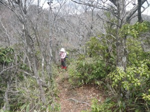 | 一気に高度を下げた | 植林帯の先に林道が見えるが | 再び笹の中を歩く |