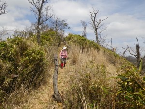 | 前ページから 黒岳分岐からすぐに親父山頂上に出る。山頂からはこれから歩く障子岳から古祖母山への稜線が見渡せる。雨がまともに当たるためここで雨具の上だけ着ることにした。気温が高いので中はTシャツ1枚で十分だ。頂上で着替えをしていると女性2名が登頂してきた。下見云々ということのようで山の会のことなんだろう。今から自分たちは、古祖母へ行くと言ったら、山頂で同じメンバーの○○さんに会ったら「私たちは周遊するので古祖母山へは行かない」と伝えて欲しいと伝言を頼まれた。結局、古祖母では誰もいなかったので伝えることはできなかった。親父山から障子岳へは、一旦降り、上り返すが、大した落差ではない感じだ。途中でB29が墜落した場所があるが、私はB29というと爆弾を投下した敵軍が打ち落とされて墜落したものと思っていたが、この時は救援物資を運んでいたが濃霧と雨で尾根にぶつかって墜落したそうだ。説明板を読んで初めてわかった。道は左に巻くように進む。出迎えてくれたように両脇にコバイケソウが葉を広げている。見晴らしがよくなって午前8時40分障子岳山頂に着く。360度の展望で形の良い祖母山が良く見える。一息ついて古祖母山を目指す。岩場を降るが、祖母山側には、天狗岩や烏帽子岩の奇峰が見える。次回はこの尾根を歩いてみたいものだ。岩場を慎重に下り、岩のヤセ尾根に出るがここで何とマンサクの花が咲いていた。シャクナゲが未だ咲いていないのは当たり前だ。左手に岩壁を見ながら降って行くと土呂久との分岐に出て通り過ぎる。左側が切れ落ちた道となって下りきると広い場所に出た。そこには第一展望台と書かれているので帰りに寄る事にする。ここからは、スズタケの多い平坦な道となり上りになると枯れた木がたくさんある異様な場所を通過する。上りがきつくなって午前9時45分古祖母山頂上に飛び出る。テーブル状の岩に立つと西側の展望が良い。しばらく伝言を頼まれていたので休憩をするが、昼食の時間には未だ早いので折り返しで来た道を戻る。青空の障子岳が時々見えて雨が上がったので雨具を脱いで歩く。ついてる私たちは改めて「ついてる」と言い合う。第一展望台に立ち寄りランチタイムだ。風が強いので岩場から引っ込んだ木のところで展望と粗食を楽しんだ。尾根歩き、岩場をクリアして障子岳に着いたのは午前11時25分だった。障子岳では、6名くらいのパーティが登って来た。空はすっかり晴れ渡り眺めは最高である。親父山からすぐに黒岳へと進む。巨木が多いということは、この辺りは原生林なのだろう。下りきると目の前にもっこりとピークがある。ちょと早いがあれが山頂かと足も軽くなる。近づくと目の前に岩壁が立ちはだかる。左に巻いてロープ場を登りつめると縦走路に出るが山頂ではなかった。もうひとつ先のピークかとも思ったが、もう騙されない。たぶんまだ先だ。狭い岩の隙間をよじ登ってシャクナゲの群生地を行くと北谷登山口との出会いの道標がある。今度は山頂だ。ロープ場の急斜面をよじ登ると一旦少しだけ下って黒岳山頂に12時30分、ようやく着いた。展望台とあるので覗くと高千穂の街が見える。次は三尖だ。何と読むのかわからないまま先を行く。急斜面を下って振り返ると今いたのが絶壁だったというのがわかる。ここからも何度もピークがあってまだかまだかと疲れもピークになってくるが、三尖は意外にも登山道脇にポツンと表示がある。(午後1時30分)写真をとって疲れたが先に進む。もう一度ピークを乗り越えると後は下りだ。スズタケの道からブナ林の斜面を抜け、再びスズタケを抜け植林帯を右に見てスズタケの道を下って行くと林道が見えてきた。午後2時10分林道に出て左を見ると無事車もあってほっとする。登山口には障子岳でお会いしたグループがちょうど降りてきた。いやー本当にハードだった。 ■コースタイム 親父山登山口−(90分)−親父山−(25分)-障子岳−(60分)−古祖母山−(35分)−第一展望台-(35分)−障子岳−(25分)−親父山(35分)−黒岳−(55分)−三尖−(45分)−親父山登山口※休憩時間は含んでいません。全行程で約7.5時間かかりました。 ■おまけ 帰路に竜ケ岩滝を見て高速道の渋滞を予想して高森町から九重を抜けることにした。途中道の駅に立ち寄り、家内との約束の温泉は産山村の温泉に立ち寄った。何とハウスを改造した面白い温泉で入浴料は400円とリーズナブルで露天風呂もあった。 ■三尖 「みつとぎり」と呼ぶらしい。確かにピークが三つあった気がした。 |