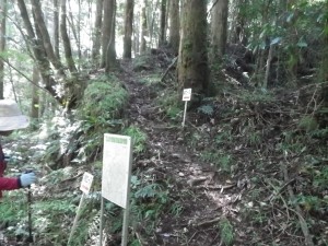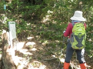 | 尾根ルートとの分岐、滝ルートへ(14:34) | 道標がある | 急斜面を降る |