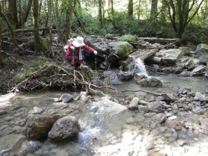 | 苔が多い | 滝コースとの分岐、尾根コースへ(12:02) | 川を渡渉する |