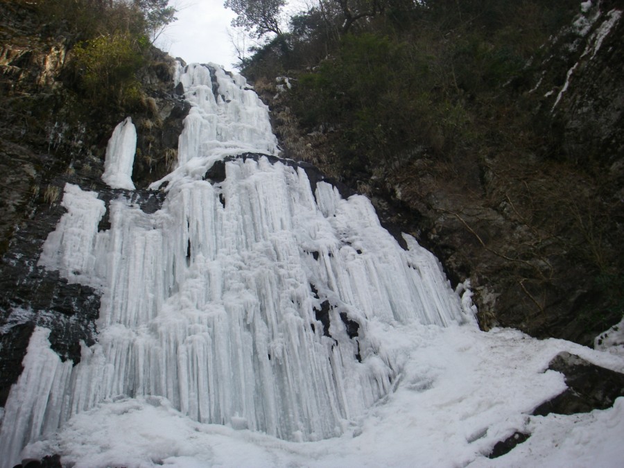 2011年2月6日 天気 晴れ 遊山歩2月例会は、英彦山の幻の滝。昨年、同じ時期に訪れたのだが今年は異常に寒く、また積雪も半端じゃない。滝までラッセルを覚悟してスタートした。メンバーはオーペン参加ということで遊山歩のメンバー以外にも集まり、総勢16名という団体になった。「幻の滝」と言うことでやはり謎めいているのか、人気が高い。 JR英彦山駅に午前8時に集合、そのままスロープカーの駐車場まで移動するが、道路の一部が凍結していて少々緊張した。駐車場で自己紹介と注意事項等の説明があっていよいよ出発である。午前8時25分駐車場を出発し、奉幣殿を目指す。階段には雪があるが、滑らない。奉幣殿でトイレを済ませ、お参りを済ませ玉屋神社方面へと進む。ここからはほぼ平らな道が続く。大雪のせいで杉が倒れていて無残な姿に。登山道も塞がれていて回り道となっているところもある。玉屋神社と鬼杉との分岐は鬼杉方面へと進む。しばらく歩くと衣ガ池に着く。ここで一服していよいよ登山道をはずれ谷間を歩く。ところがトレースはしっかりしていて道ははっきりしている。かなりの人が歩いた跡のようだ。メンバー以外の登山が一人先を行く。勾配は徐々にきつくなり、それに伴って雪も深くなる。つぼ足で進めばラッセルしなくて済む。急斜面の谷を詰めると滝が現れた。とんでもなく凍っている。見事である。昨年とはまるで違う滝のようである。撮影会も終わり、下山開始であるが、途中で別のピッケル軍団とすれ違う。この滝は知れ渡ってしまい、「幻」の名を変えるときが来るのか、いやひとまず「幻だった滝」としておこう。登山道に戻った我々はリーダのMORIさんからこれからスペシャルコースを行こうと提案がある。スペシャルコース?と言っても私も知らない。ついて行くだけだ。登山道をしばらく戻り途中から左に入り込む。倒木でまともに歩けない。結局私がラッセルすることに。岩のヤセ尾根に出るとMORIさん奥さんが再び先頭に。鹿の踏み跡をたどり歩く。ところが一段上がった岩の上には鹿の踏み跡がない。高すぎて諦めたようだ。よっしゃーと言うことでカラスの出番ある。よじ登ってとトレースを造る。再び鹿の足跡が現れなぜかほっとする。森の中に入り登りつめると「811mの標高点」と札がある。ここで昼食をとることに。下山はこの先を道なき道を下る。下りきると玉屋神社からの登山道に合流した。しばらく歩くと今朝歩いてきた分岐に出て後は往路を戻る。無事駐車場に着いたのは13時40分であった。 今日も楽しく怪我も無く、無事帰れました。本当に感謝の1日でした。 |