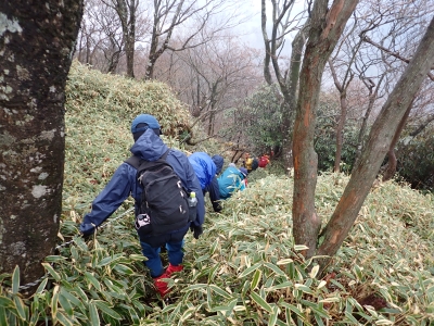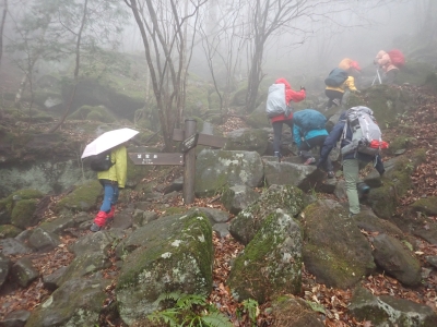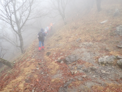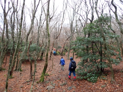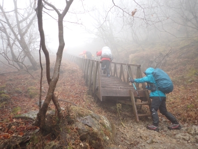 アタック山の会の例会山行は長らく神殿改修工事で中岳への通行ができなかった英彦山。青空が広がるのを期待したが、下山するまでガスで視界は広がらなかった。それに高度上げると寒さは厳しく、中岳での避難小屋では震えながら食事をした。これも良い経験だ。南岳へ往復する予定だったが、メンバーの披露等も考慮し、CLのM氏の決断で早々に下山することにした。もちろん私も賛成である。とにかく楽しい登山のはずが、過酷になるのは目的に反することだ。北西尾根を久しぶりに歩いたが、やはり気持ちの良い尾根だ。今回は車を豊前坊と野営場(キャンプ場)の駐車場にデポしておいたのでかなりのショートコースだったが、寒さのせいで結構体力を消耗したようだ。それでもメンバー皆、無事下山した時は笑顔で溢れていた。こんな天候でも楽しめたのは皆のおかげだ。今日も山に自然に仲間に感謝!!。
