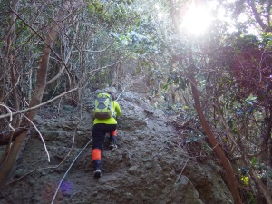 | 手の絵が彫られている(11:01) | 岩壁の下を通過 | ロープを補助に |