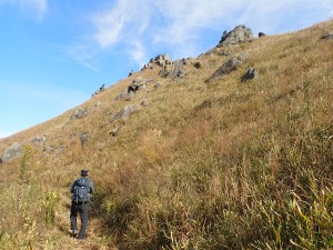 | 貝殻山の頂上は行かず反対側に降る | 面白い岩が見える | 野焼きした脇の登山道を行く(10:01) |