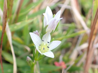 『うぅさむぅ』車から降りると思わず声に出た。見上げると空は冬模様。ポツポツと雨が降り出したのでスマホで雨雲レーダを見たが雨雲は見当たらない。予報は「曇り時々晴れ」となっている。雨具を着るほどではないが、薄手のウィンドパーカだけではとても寒いので、その上から雨具を着ることにした。そうこうしていると車が続々と狭い駐車場に入ってくる。今日のお目当てはセンブリとウメバチソウだ。中峠から四方台を目指す。そして貫山を目指すが、今日はその手前で林道を歩くことにした。鬱蒼とした道は、以前よりも荒れた感じで暗い。樹木が成長して陽射しを遮っているせいだろうか、ツル科の植物がほとんど消えていた。もちろん「山芋」もだ。この林道の途中から貫山頂上への道があるはずだが、それらしい目印があったが以前と変わっていて明確でない。目の前から男性が1名現れた。思わず「珍しいですね、この道を歩くとは」と声をかけると初めて歩くとのことだった。「熊は出ないと思うけど気をつけて」と心の中でつぶやいた。四差路に出て小穴を見ながら中峠に戻り茶ケ床園地へと舗装道を歩く。そして思わぬ出合い。メンバーのHさんが一人で歩いてくるではないか。せっかくなので「ウメバチソウのたくさんある場所へご案内」と言うことで再び四方台方面へ。花々を見て楽しんで四方台の肩でのんびりと絶景を眺めながらランチをしているとこれまた偶然、念仏坂(仮称)を登り切って現れた登山者が何とYさんだった。Hさんは思わず立ち上がってYさんとハグをして出合いに喜んでいた。何年も会ってない家族のように。私も仲間に加わりたかったくらい嬉しいのが不思議だ。ランチを終え、今度はYさんに花々を楽しんでもらい茶ヶ床園地に戻った。HさんとYさんは観察センターへ降った。茶ヶ床園地の駐車場は満車で次から次へと車が来るので出られなくなってしまい、見かねた人が交通整理をしてくれて無事脱出。感謝です。観察センター駐車場着くとYさんと合流。公共交通機関で来たYさんを私の車に乗せて途中でお別れ。目的の花々に出会えた上に、思わぬ偶然の出合いに感激する今日の平尾台だった。今日も自然に山に仲間に感謝!! |