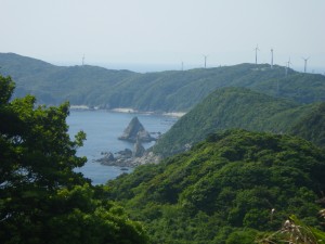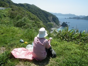 | リアス式海岸(絶景です) | 眺めを楽しみながら昼食 | 道路挟んで反対側に登山口 |