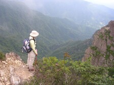 2007年6月23日 天気 曇り 我家は愛犬がいるため、なかなか泊まりで出かけることができないが、今回は長男が協力してくれて安心して?出かけることができそうだ。MORIさんが祖母傾山に連れて行ってくれるとのことでテントなど準備し午前5時30分に自宅を出発。雨模様なので心配だが、南に走るにつれ、天気は回復に向っているようだ。 <アクセス> 北九州方面からだと宇佐別府道の米良I.Cで降り、国道10号線を南に下る。犬飼を過ぎ、三重町の豊後総合庁舎前より国道326号線に入る。三国トンネルを過ぎ、越野を過ぎて水無平方面へ右折する。道なりに行き、黒仁田林道の標識より、右折する。 舗装道から砂利道となり、道幅も狭くなり、車高の低い車では底をつく。この林道は約10Kmも続く。時間がかかるので十分余裕を持った方が良い <コース詳細>黒仁田林道を車で約10Kmほど行き、適当なスペースに駐車し、さらに荒れた林道を歩きます。まっすぐ行くと登山道となり(途中で赤ペンキなどの印や小さな標識がある)植林帯から自然林となり、出発から約25分で水場に出ます。道は急になり鹿が出そうな自然林を進むと稜線が見えてきます。水場から約10分で広場のような九折越(つづらごえ)に出ます。ここは救助用のヘリポートとのことです。左(西)に行けば九折越小屋があるようです。右手(東)には傾山のかっこの良い山頂が見えます。今回はここで早めの昼食としました。九折越より東に進路をとり、なだらかな稜線歩きが続きます。クマザサが多く、もしかしてササユリなど咲いていないかなどと話しながら目の前に山頂が現れ、急登を喘ぎながら杉ケ越との分岐を見て思いもしなかったミヤマキリシマの花々に出会え驚き、周りは巨岩となり後傾に到着です。眺めを楽しみ、一旦下り、東から北西に回り込み駆け上がると傾山頂です。巨岩群と展望を楽しみ最高の気分です。帰路は往路をとります。帰りに九折越小屋を見て帰りました。 <参考コースタイム> 駐車SP−(25分)−水場−(10分)−九折越−(70分)後傾−(10分)−傾山山頂−(60分)−九折越−(10分)−水場−(20分)−駐車SP ※休憩時間は含んでいません。全行程で約5時間でした。 |
