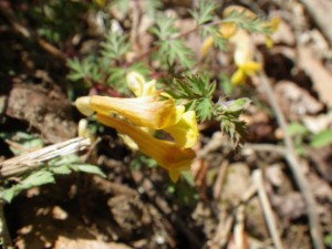 | ミツバツツジが咲いていた | 道路を歩く今日のメンバー | キケマンがたくさん咲いていた |