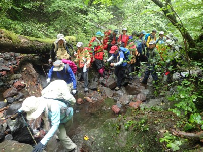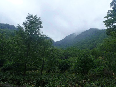 さて、男池の登山口から入山するが、すぐにキツネノカミソリが群生している。何度も来ているのに初めて見る光景だ。そしていつもなら水が溜まることがない沼は池になっていた。かくし水手前で他のグループが下山してきた。当会メンバーの知り合いがいたようでやはり北九州からのようだ。「物好きだなあ」とまたしても自分たちのことを棚に上げて・・・・・。話を聞くとかくし水まで行って戻って来たとのこと。これから散策をしてバーベーキューだそうだ。ソババッケが、どうなっているか、泳いで渡るほど水があるのか・・・などと想像を膨らますが、実際には水は溜まっていない、ただ、ぬかるむ。靴もズボンも泥だらけだ。シャクナゲの多い原生林の中を歩く、緑がきれいだ。岩が滑る。慎重な進行は、普通の倍近く時間を要する。ようやく風穴の近くまで来た。ここで雨粒と一緒に昼食だ。そしてここで引き返すことを決断する。男池に無事下山し、黒嶽荘へ、ずぶ濡れになったので風呂が有り難い。3〜4人ずつしか入れないが良いお湯だ。何しろ炭酸水だ。部屋ではビールで乾杯!夕食は地鶏の炭火焼きと山菜やエノハ(ヤマメ・アマゴ)の塩焼きとご馳走だ。夕食後は部屋で二次会。楽しい夜を過ごした。
