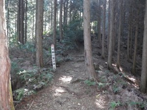 | 「九州百名山元越山」と大きな木柱 | 竹林から雑木林に | えぐられた登山道 |