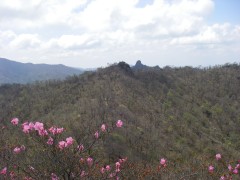 | (前ページからの続き) しばらく展望を楽しんだら今日の終点のお姫山を目指します。上りと反対の急斜面を降ります。この辺りの雰囲気も何とも言えません。降りきると再び上りとなりお姫山山頂です。五葉岳よりも狭い岩場の山頂です。鹿納坊主がまじかに迫っています。景色を堪能して下山は往路を戻ります。夏木山を過ぎて夏木新道と犬流れへの分岐地点鞍部から夏木山と反対側の飛び出たピークに寄り道をして来た道を戻りました。登山口に着いたのは15時15分でした。 <コースタイム> 夏木新道登山口-(50分)-あけぼの平-(35分)-船石-(5分)-稜線-(15分)-夏木山山頂-(20分)-大吹峠分岐-(15分)-五葉岳-(30分)-お姫山-(20分)-五葉岳-(15分)-兜頭巾分岐-(80分)-夏木山-(80分)-夏木新道登山口 ※休憩は含んでいません。全行程で約8時間30分かかりました。 <感想> 鋸尾根を楽しみにしていましたが、通行止めを行くのは安全登山に反することです。断念するのも勇気のいることだと私は思いました。リーダーのMORIさんの適格な判断で今日も無事に下山できたことと感じました。感謝です。 今回はアケボノツツジやシャクナゲ、ミツバツツジ、ヒカゲツツジと思う存分花を楽しみました。それと山仲間とのキャンプも格別です。本当に楽しい3日間でした。それとメンバーからの写真で自分が映ったものが掲載できたことも感謝です。良き想い出となることと思います。 |