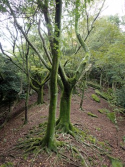 平成28年10月23日(日) 天気 雨のち曇り ■出発時間:午前6時30分(小倉南区葛原) 東九州道は宇佐I.Cで降りる。帰路は道の駅なかつを経由し、上毛I.Cから高速道。 ■メンバー:女性7名、男性5名 予定では宮崎県の行縢山(むかばきやま)を歩く予定だったが天気予報は雷雨&豪雨。 集合場所で別の山に変更することを伝える。幸い国東方面は曇りの予報だった。 3台の車で登山口目指す。不動口から下山口である赤根登山口に車をデポする。 雨は止んでいるが今にも降りそうなので雨具の上着だけ着る。シャツだけでは少々寒いのでちょうど良い。千灯寺跡地、奥ノ院、五輪塔群と山岳宗教の遺跡巡りとも言える山行は不動山で終わりだ。不動山直下には、国東半島アートプロジェクトの事業として人体を型で造った像が設置されていた。遠くから見ると本当に人が立っているように見える。少々不気味ではあるが、作成の過程や設置の模様を知るととても温かさを感じる。 不動山から千灯岳への縦走路は通常の登山道となって雰囲気がまるで変わる。 鹿ネット沿いに緩やかな道を進み舗装道に出る。小さな粒の雨が白い空から降っている。 ここで昼食をと思ったが、少し登山道を進んでみることに。それが正解ですぐに樹林の中にベンチがある場所があったのでここで昼食とした。 昼食を終え、リュックは軽くなったが、身体は重くなった。これからきつい登りが始まる。 「形の良い山は、きつい」である。高度を上げて行くとまたまた雰囲気が変わる。苔むした石と樹で緑一色だ。と言っても濃淡があるのでとてもきれいである。これこそ自然が造りだしたアートでないか・・・。山頂に着くと、以前訪れた時よりも広く感じる。きっと草や樹が茂っていたのではないだろうか。 下山は、あかねの郷側へと降る。もちろん急斜面だ。途中で鹿が逃げて行ったが良く鳴いていた。今日も自然に山に仲間に地元の人に感謝!! ■コースタイム 不動口-(35分)-旧千灯寺跡-(35分)-茶店-(20分)-五辻不動尊-(45分)-林道-(60分)千灯岳頂上-(65分)-あかね登山口※休憩時間含まず。全行程で約5時間でした。標高差539m |
