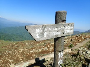| 丹沢山から伸びる峰々 | 後沢乗越1.7kmとある(鍋割山頂上) | 鍋割山頂上(9:43) |