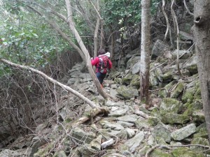 | 転ばないように慎重に | 石だらけの場所は速やかに横断 | 植林帯をのんびりと歩く |