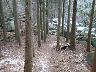 | 林道に出るとアイゼンを脱着(14:10) | ここからは往路を戻る | 巨石群を縫うように | |