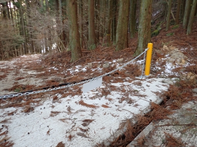 | ぶな尾根コースとの分岐は真っ直ぐに | 林道は崩落している | 慎重に | |