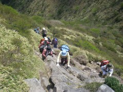 | 普賢岳目指し一旦降る | 国見岳の露岩した斜面 | ハルトラノオの群生 |