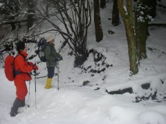 2009年1月3日 天気 曇りのち晴れ 昨年の12月にMORIさん夫妻と英彦山を歩いたが、その時に来年の初登山は牛年でもあるのでぜひ高住神社に参拝したいと考えていた。私から御誘いするつもりが、先にMORIさんから「裏英彦山ルートを歩きませんか」と御誘いがあり、早速出かけることにした。AM8時15分JR彦山駅に着くとがしんさんも来られていて、何と今日が誕生日とのこと。めでたい新年の初登山になった。 <今回のコース詳細> 高住神社から薬師林道へと歩きます。途中、左に鷹ノ巣山登山口の標識があります。(薬師峠)さらに進むと右手に裏英彦山道への取り付きがあります。なだらかな杉林を尾根に向かって上ります。尾根に出ると急登となりますが、上りつめないで左に巻いて行きます。何度かアップダウンしながら文字通り英彦山の裏側を歩いて行きます。ルートを確認しながらケルンがたくさんある(雪で隠れていますが)ケルンの谷に着きます。ここから谷間を稜線目指し、急登します。積雪で新雪のため時間がかかります。急登に喘ぎ谷を登り詰めると中岳から南岳への迂回路に飛び出ます。ここから中岳へと進路をとります。中岳上宮でお参りをして小屋で昼食です。ようやく青空が広がってきました。昼食を済ませたら北岳を目指し、終点の高住神社へ下山します。(今までの過去日記を参照) <コースタイム> 高住神社−(20分)−裏英彦山道入口−(1時間50分)−ケルンの谷-(60分)−中岳、南岳の迂回路-(8分)-中岳山頂-(25分)-北岳山頂-(15分)-北岳肩-(40分)-高住神社 ※休憩時間は含まれていません。全行程で約6時間でした。 <コメント> 予定外に積雪が多くその分楽しむことができました。わかりずらいルートですがMORIさんのおかげて無事下山できました。また、神社で偶然はまちゃんにお会いしました。「またお会いしましょう。」なお、このルートは積雪の場合、目印がわかりずらいので初めての方は危険です。 |