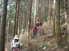 | 前ページから 山頂でゆくりっと食事を済ませ下山ですが、今日の見どころカニのハサミ岩を見て下ります。山頂より来た道を少し戻り、分岐より山ノ神へ降ります。檜の植林帯から小さな谷へ出てしばらく行くと前方にカニのハサミ岩が見えてきます。飛び出た岩に立ち乗ると良く見えます。ジグザクの道から再び植林帯に入り真っ直ぐな谷間を下りきると林道に出ます。林道を右にひたすら歩くと登山口に出ます。途中、カニのハサミ岩が見える場所があります。 <参考コースタイム> 矢谷登山口-(50分)-穴川分岐-(50分)-山頂-(30分)-カニのハサミ岩が良く見える飛び出た岩-(40分)-林道-(35分)-矢谷登山口 ※全行程で約4.5時間でした。(あくまでも参考時間です) <感想> 上りのコースは、沢沿いで自然林の中、気持ちの良い素晴らしいコースでしたが、下山の植林帯は、単調でさらに林道歩きも長いので少々飽きてしまいました。しかし、何よりもカニのハサミ岩を正面で見れる場所や林道から見上げることができるのでこのコースは必須です。それと歩く距離は短いものの、登山口までの移動が大変だと感じました。特に宿ケ峰尾峠から意外と遠く、カーブがとにかく多い道なので車酔いにも注意です。一泊で国見山とセットにすると良いかも知れません。 |