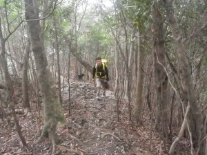 | きつい斜面が続く | 潅木帯になったようだ | ツバキの花がたくさん落ちていた |