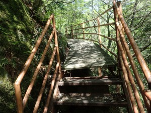 | 木製の階段は一部朽ちている | ミツバツツジだ | またまた橋がある |