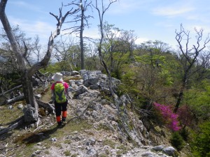 | 白骨化した木(半分生きている) | 山頂にて | ミツバツツジ |