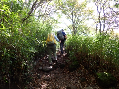 アタック山の会9月の例会山行が、天候の影響で延期になり本日となったが、三連休と運動会シーズンともあって参加者がなんと3名と今まで最小の参加人数となった。CLはM氏、とても残念だけどこういう時もあると互いに励ます。それにしても今年の夏は長い。10月中旬だと言うの日中の気温は30度越である。由布岳の駐車場に着くともちろん快適な気温だが、歩き出すと陽射しを背に受けて暑さを感じ出す。森に入るとしばらくは涼しさを感じる。合野越で一休みして樹林帯を高度を上げながら歩く。ジグザグな道が続き、森を抜けると陽射しが熱い。展望が開けると何と雲海が広がっている。雲の上を歩けるような錯覚を起こす。徐々に足下の石が大きくなってゆき、鞍部の手前ではガレ場となる。その頃には後部から多くの登山者から煽られるようにマタエに着く。さすがにここは標高も高く、風もあって涼しい。日影で少々長い休憩をしていよいよ西峰への岩場へ取付く。ヘルメット、スワミベルト、シュリンゲと少々大げさかも知れないが、安全確保は会の決まりである。特に高齢になると腕力も衰えて自力でのリカバリーは困難である。鎖場を慎重にクリアしてゆく。特に障子戸と言われる岩壁は危険だ。ここでは過去滑落事故で亡くなった方もいる。無事、西峰に着くと展望が迎えてくれた雲海も素晴らしい。ここでランチタイムを過ごしていると登山者が次から次へとやってくる。下山は往路を戻るが、登りで慣れたせいか、スムーズに鎖場をクリアしていった。マタエからの下山は、登ってくる人とのすれ違いでこの山の人気がとてもあることを改めて知る。駐車場が見えてくると暑さが厳しく汗だらけで登山終了。今日も山に自然に仲間に感謝!